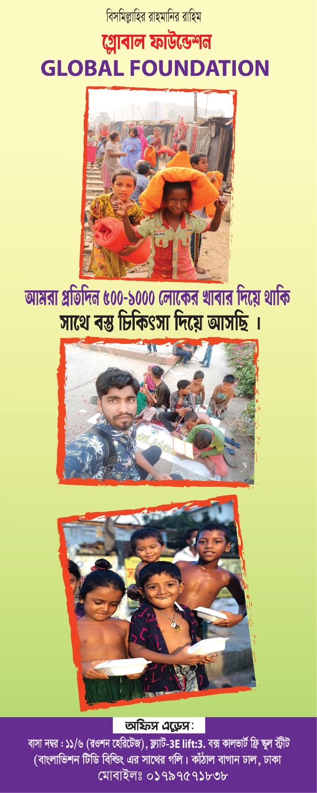 আমরা একটি মানবসেবামূলক দাতব্য সংস্থা, যার প্রধান লক্ষ্য সমাজের অসহায় ও সুবিধাবঞ্চিত মানুষের পাশে দাঁড়ানো। আমরা বিশ্বাস করি, সকল মানুষের মৌলিক অধিকার রয়েছে, এবং দারিদ্র্য, শিক্ষা, স্বাস্থ্য ও বাসস্থানের অভাবে কেউ পিছিয়ে থাকতে পারে না। আমাদের সংস্থা নিরলসভাবে কাজ করে সমাজের দুঃস্থ ও দরিদ্র মানুষের জন্য। আমরা খাদ্য বিতরণ, চিকিৎসা সহায়তা, শিক্ষার সুযোগ প্রদান এবং আশ্রয়হীনদের জন্য নিরাপদ বাসস্থান তৈরি করার মাধ্যমে মানবতার সেবায় আত্মনিয়োগ করেছি। আমাদের প্রচেষ্টা শুধুমাত্র দান-অনুদানে সীমাবদ্ধ নয়, বরং আমরা মানুষের জীবনে দীর্ঘস্থায়ী পরিবর্তন আনার লক্ষ্যে কাজ করছি। আপনিও আমাদের এই মহৎ যাত্রায় যুক্ত হতে পারেন। আপনার ছোট্ট সাহায্য একজন অসহায় মানুষের জীবনে বিশাল পরিবর্তন আনতে পারে। আসুন, একসাথে একটি সুন্দর ও সমৃদ্ধ সমাজ গড়ে তুলি। “মানবসেবাই প্রকৃত ধর্ম” – আসুন, ভালোবাসা ও সহানুভূতির হাত বাড়িয়ে দেই।